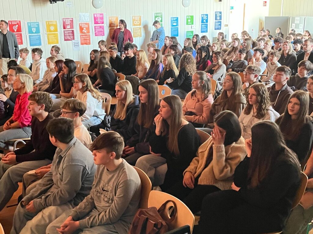 Er las in der Aula jeweils für die Jahrgänge 9 und 10 aus seinem Buch „Und am Himmel kein Zeichen. Ein Gleichnis für Mutige.“