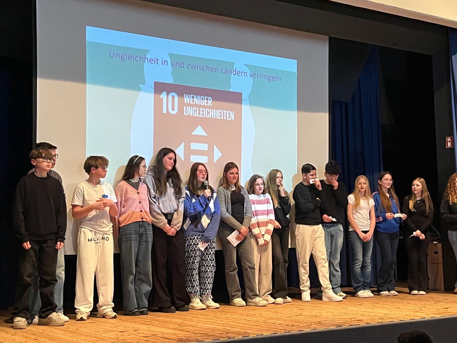 Am 9.3. haben die Schüler*innen der 7. und 8. Klassen unserer Schule im Rahmen des zweiten FreiDay-Projekttages wieder zahlreiche selbstgeplante Projekte rund um die 17 Nachhaltigkeitsziele der Vereinten Nationen umgesetzt. Nachmittags präsentierten sie diese den Gästen in der Aula – unter anderem waren unser Bürgermeister Herr Kibbert, viele Eltern und auch jüngere Schüler*innen der Humboldtschule eingeladen. Die Schülerinnen Lia und Lina führten durch das Programm, während die Bühnentechnik von den Schülern Justus, Phil und Lennart betreut wurde.
